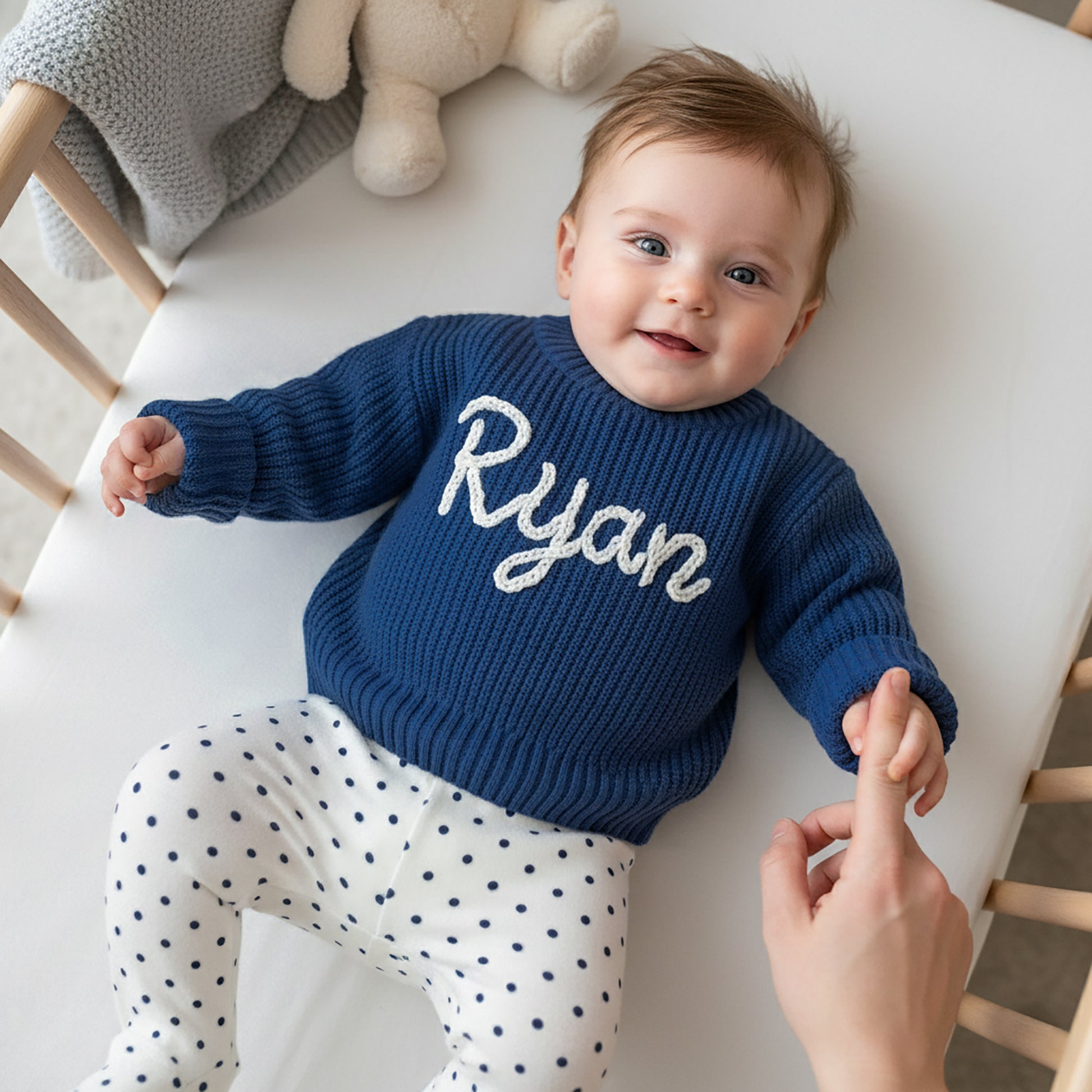 A handcrafted personalized baby sweater, carefully embroidered with your baby’s name. Each piece is made from premium, baby-safe yarn that is buttery soft, breathable, and free from harsh chemicals. Perfect for everyday wear or as a thoughtful gift.